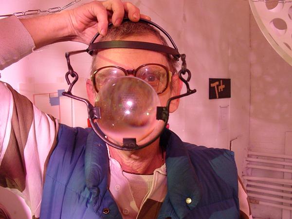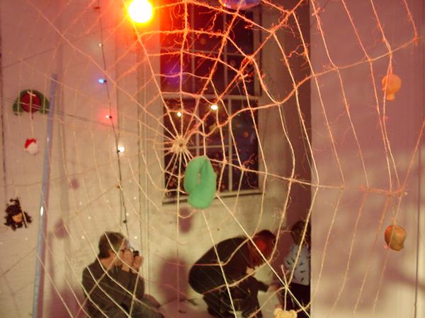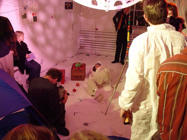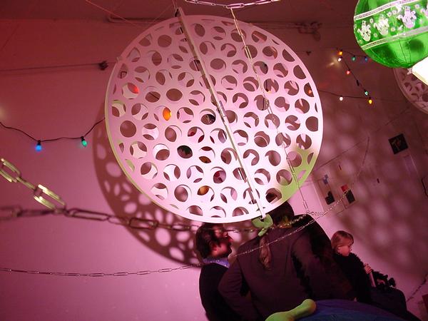 Adelheid Mers (three colored par [lights]), Mark Genrich (rotating [wheels] with holes), Shuko Wada (painted the [walls] white),