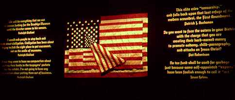 The first spotlight rests on three American flags of different sizes stacked centrally (á la Jasper Johns) on the wall opposite the entrance, the smallest not securely attached and falling off the wall. Flanking this Great American Symbol, the gothic-font white lettering of six quotes taken from Rudolph Giulliani, Pat Buchannan, Pat Robertson, and Jesse Helms glows bright on the dark wall. These dramatic and inflammatory quotes, as you expect, depict conservative sentiments concerning good sense, civilization, excrement, and money, specifically the taxpayers' money allotted to the funding of art.